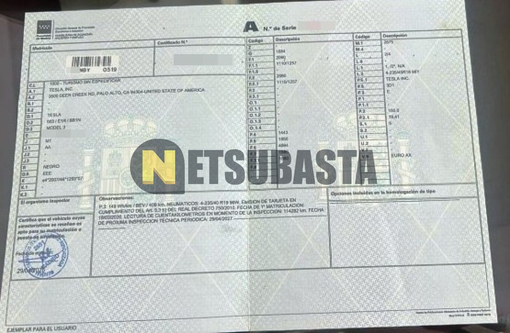 Subasta de Tesla Model 3 Estandar Plus RWD 2020 Siniestrados, Marca Tesla, Modelo Model 3 Estandar Plus RWD, Combustible Eléctrico, Kilometraje 150.000 KM, Fecha 1ª matriculación 03/2020, Matrícula ****NBY, Color Exterior , Color Interior , IVA REBU y Ubicación Málaga.