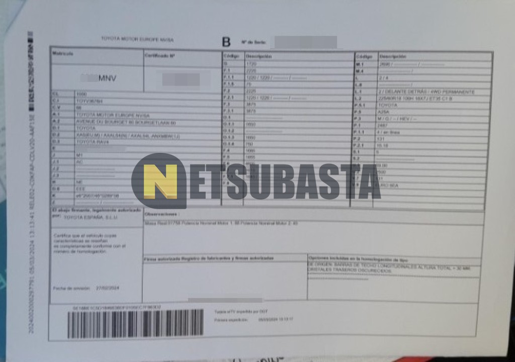 Subasta de Toyota RAV4 Hybrid 220H 4x4 2024 Siniestrados, Marca Toyota, Modelo RAV4 Hybrid 220H 4x4, Combustible Híbrido (Electro/Gasolina), Kilometraje 73.000 KM, Fecha 1ª matriculación 03/2024, Matrícula ****MNV, Color Exterior , Color Interior , IVA REBU y Ubicación Sevilla.