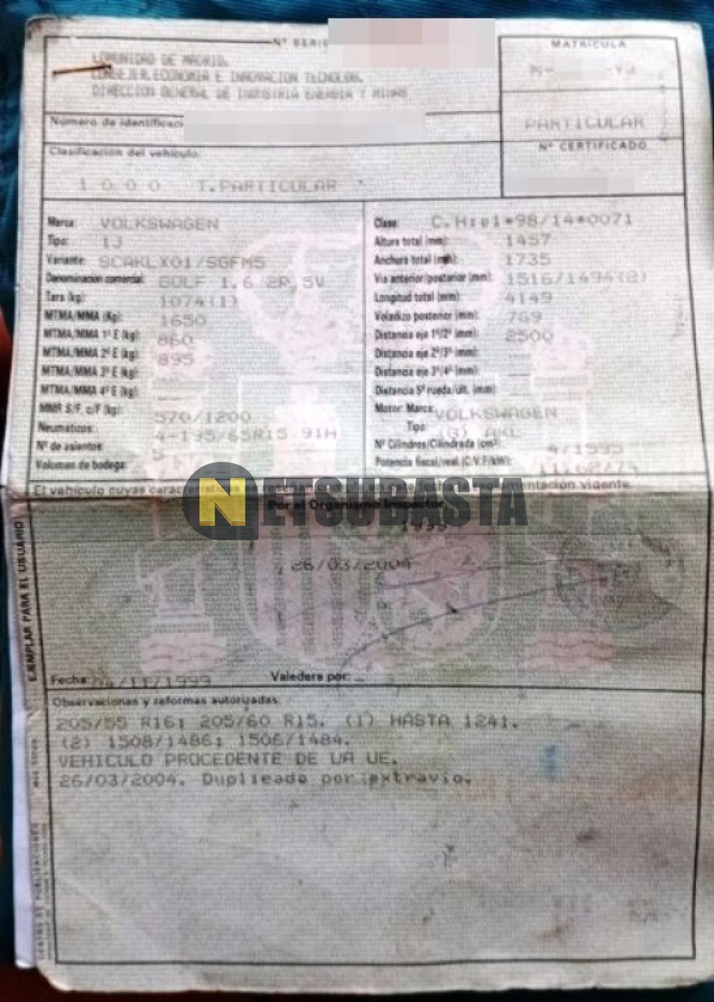Recuerde que si lo desea, puede imprimir la ficha del vehículo Volkswagen Golf 1.6 1999 con todas sus características técnicas.