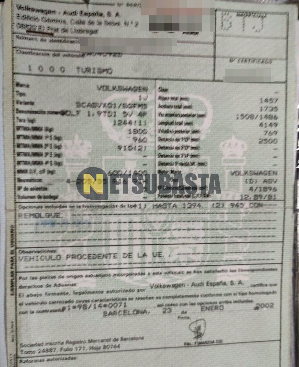 Subasta de Volkswagen Golf 1.9 TDI 2002 Siniestrados, Marca Volkswagen, Modelo Golf 1.9 TDI, Combustible Diésel, Kilometraje 129.000 KM, Fecha 1ª matriculación 03/2002, Matrícula ****BTJ, Color Exterior , Color Interior , IVA REBU y Ubicación Gerona.